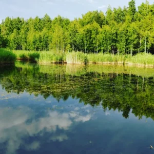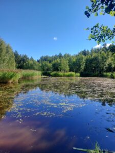 vesipiste. Lampi on matala ja siinä on savi/muta pohja ja vesikasvillisuutta.