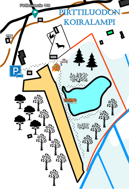 Koiralampi on tarkoitettu vesityöskentelyn harjoitteluun, EI koirien ulkoilutukseen. Aluetta EI ole